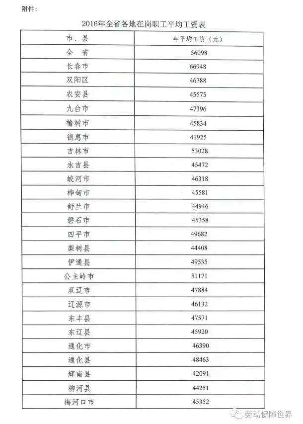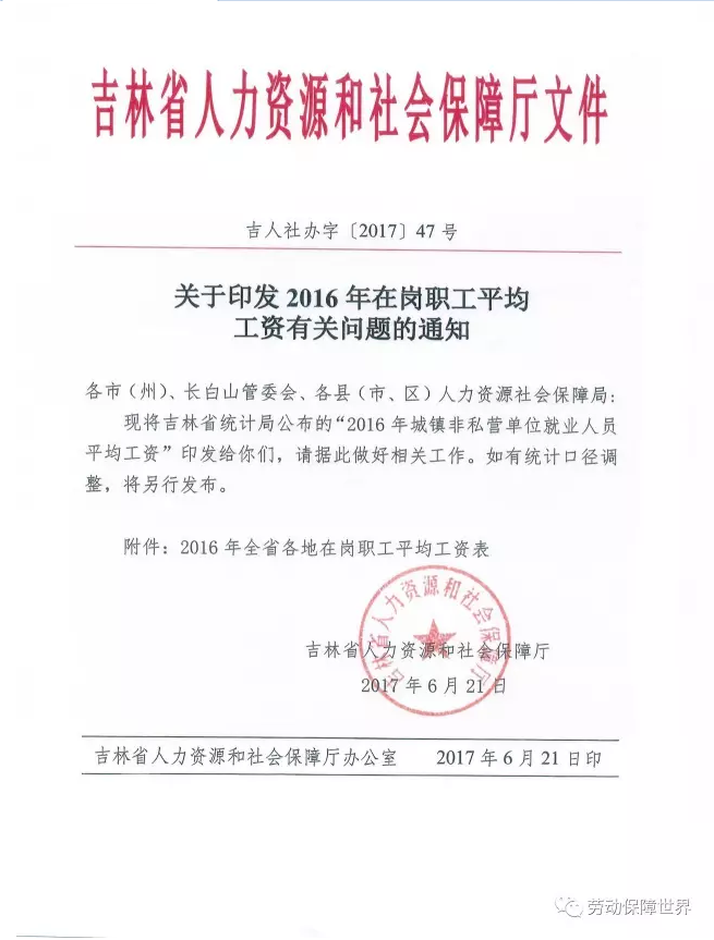 吉林省人力資源和社會(huì)保障廳關(guān)于印發(fā)2016年在崗職工平均工資有關(guān)問題的通知(吉人社辦字〔2017〕47號(hào))