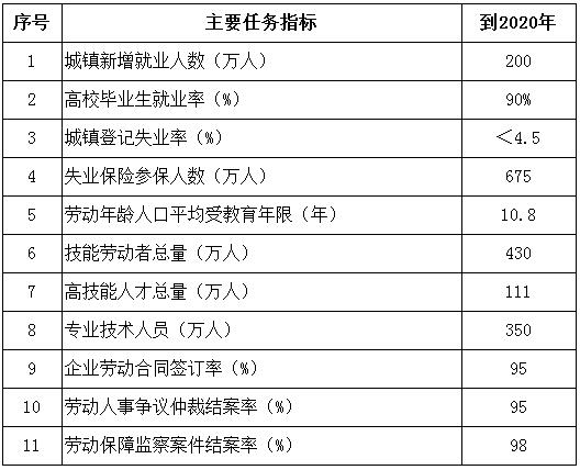 “十三五”期間,重點實施就業(yè)崗位開發(fā)、教育供給側結構性改革、勞動者技能提升、公共就業(yè)服務體系建設、“雙創(chuàng)”環(huán)境優(yōu)化、創(chuàng)業(yè)帶動就業(yè)、高校畢業(yè)生就業(yè)促進、重點群體就業(yè)促進等八大就業(yè)工程,實現(xiàn)就業(yè)規(guī)模穩(wěn)步擴大,就業(yè)質量進一步提升;創(chuàng)業(yè)環(huán)境顯著改善,帶動就業(yè)能力持續(xù)增強;人力資源結構不斷優(yōu)化,勞動者就業(yè)創(chuàng)業(yè)能力明顯提高的總體目標。到2020年要完成以下工作任務: