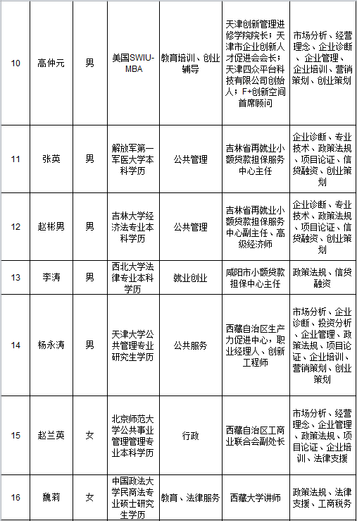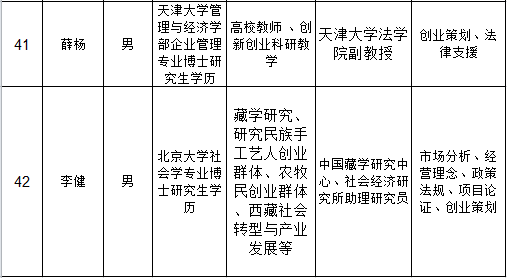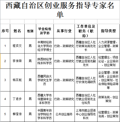《西藏自治區(qū)人力資源和社會保障廳關(guān)于面向社會公開招募創(chuàng)業(yè)服務(wù)指導(dǎo)專家的公告》發(fā)布后,社會各界有能有志之士講信念、講奉獻,踴躍報名參加創(chuàng)業(yè)服務(wù)指導(dǎo)專家團隊,志愿為我區(qū)創(chuàng)業(yè)者提供幫助,為我區(qū)創(chuàng)業(yè)服務(wù)事業(yè)貢獻力量。現(xiàn)將程賢文等42名符合條件專家名單予以公示,公示期7天,即5月9日—5月16日。