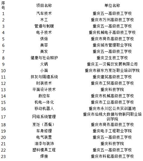 第45屆世界技能大賽將于2019年在俄羅斯喀山舉行。為切實(shí)抓好備戰(zhàn)工作,做好選手選拔培養(yǎng),按照《世界技能大賽市級(jí)選拔集訓(xùn)基地建設(shè)管理辦法》(渝人社發(fā)〔2017〕18號(hào)),經(jīng)單位申報(bào)、行業(yè)主管或區(qū)縣行政部門(mén)推薦、專(zhuān)家評(píng)議和公示等程序,決定在重慶五一高級(jí)技工學(xué)校、重慶城市管理職業(yè)學(xué)院等單位建立汽車(chē)技術(shù)、美發(fā)、美容等23個(gè)第45屆世界技能大賽市級(jí)選拔集訓(xùn)基地,項(xiàng)目建設(shè)周期為2年。