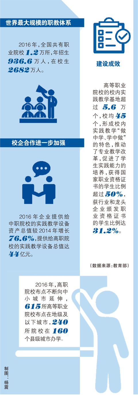 來自教育部的數(shù)據(jù)顯示,目前全國(guó)職業(yè)院校共開設(shè)近千個(gè)專業(yè)、近10萬個(gè)專業(yè)點(diǎn)。中職畢業(yè)生就業(yè)率連續(xù)10年保持在95%以上,高職畢業(yè)生半年后就業(yè)率超過90%。職業(yè)院校畢業(yè)生成為支撐中小企業(yè)發(fā)展、區(qū)域產(chǎn)業(yè)邁向中高端的生力軍。