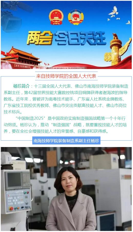 全國人大代表、佛山市南海技師學(xué)院裝備制造系副主任楊珍表示:“重視技能人才培養(yǎng),就要進一步深化技工教育的發(fā)展,讓高技能人才真正高起來,就要讓技能人才人人得到一種社會的認可,讓大家都有成就感、幸福感。”