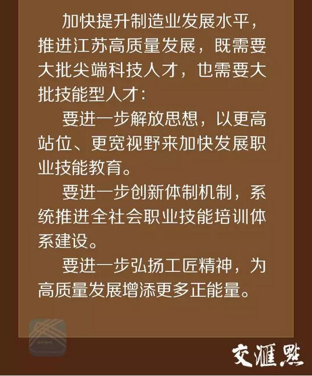 近期,江蘇省委書記婁勤儉就加強(qiáng)技能人才培養(yǎng)赴常州等地進(jìn)行調(diào)研。他強(qiáng)調(diào),江蘇是制造業(yè)大省,要緊密結(jié)合現(xiàn)代產(chǎn)業(yè)體系建設(shè)大力發(fā)展職業(yè)教育,培養(yǎng)更多大國工匠,造就龐大的高素質(zhì)技能人才隊(duì)伍,在全社會大力弘揚(yáng)工匠精神,營造精益求精的敬業(yè)風(fēng)氣,為提升江蘇制造水平、推進(jìn)轉(zhuǎn)型發(fā)展提供有力支撐和強(qiáng)大保障。