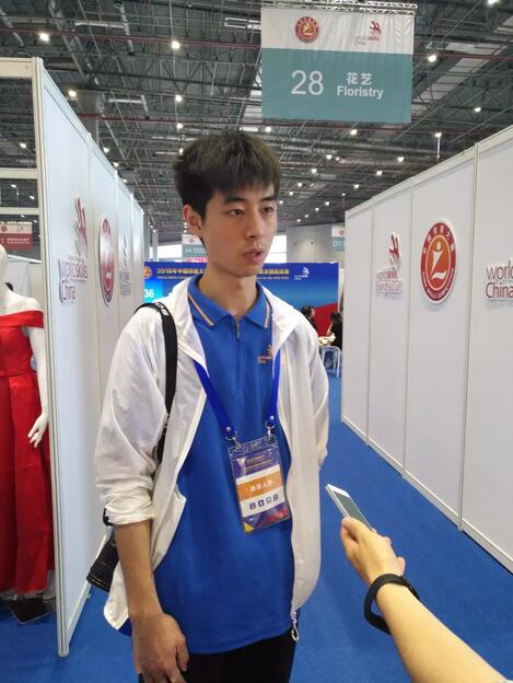 第45屆世界技能大賽全國(guó)選拔賽花藝項(xiàng)目裁判長(zhǎng)朱迎迎(右一)在接受記者采訪