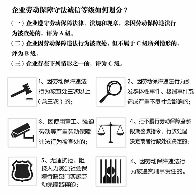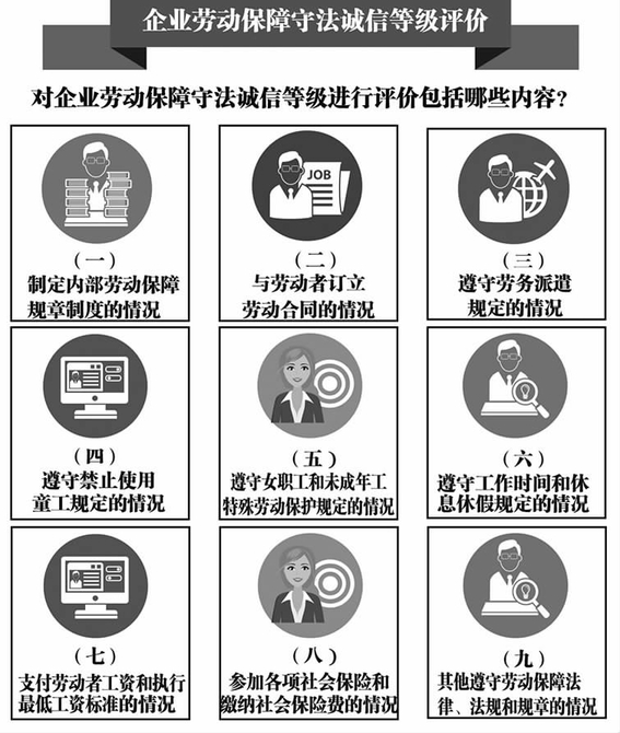 《評價辦法》為守法誠信等級評價制度的進一步完善提供了明確的政策依據(jù),指明了清晰的發(fā)展方向。在具體實施過程中,還有以下幾個方面需要予以關注:其一,注意分類監(jiān)管的宣傳方式,避免社會上產(chǎn)生分類監(jiān)管是勞動保障監(jiān)察領域免檢制度的誤解;其二,關注聯(lián)合懲戒措施設置的合法與合理性,失信情形與懲戒措施之間應具有合理關聯(lián),權利限制與制度目標之間應符合比例原則;其三,關注誠信等級評價制度、重大違法行為公布制度以及“黑名單”制度之間的功能配合與銜接,推動形成規(guī)范有序、運行順暢的勞動保障誠信體系。(中國勞動和社會保障科學研究院 李文靜)(圖表內(nèi)容來源:《企業(yè)勞動保障守法誠信等級評價辦法》 姜偉偉 繪)