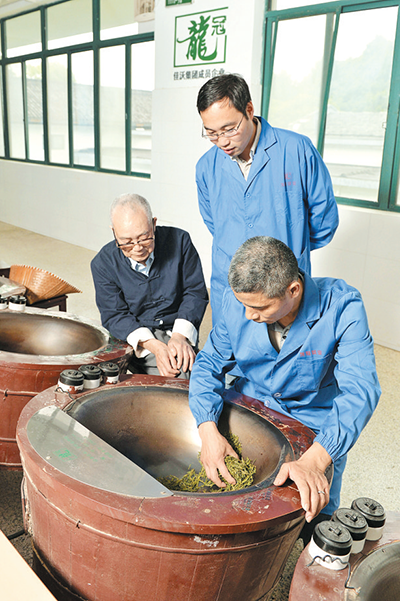 圖為王卓再老場長(左)指導(dǎo)來國水(右)、汪旭明(中)炒制龍井茶。
