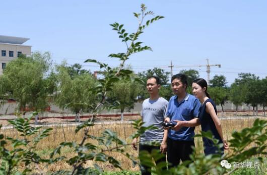 2018年6月14日,在山西省運城市鹽湖區(qū)解州鎮(zhèn)社東村,李佩宣(右)正在指導村民任廣勝(中)、馬志鋒(左)用植保無人機噴灑農(nóng)藥。(楊晨光 攝)