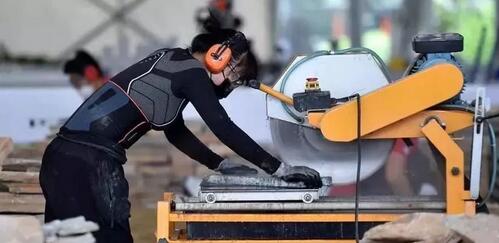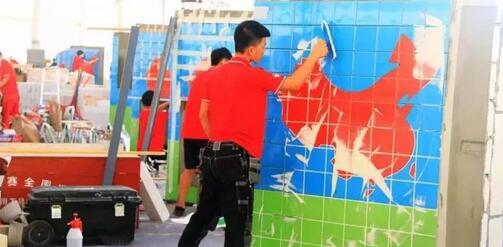 在瓷磚貼面的現(xiàn)場(chǎng),18支隊(duì)伍選手忙著對(duì)瓷磚進(jìn)行切割,切割機(jī)器的聲音此起彼伏。選手們需要在3天里完成A墻、B墻及地面三面貼磚,其中A墻為東方明珠塔形象,B墻為中國(guó)地圖形象,地面需要選手自己鋪裝,是“2018”簡(jiǎn)化后的“18”兩個(gè)數(shù)字。