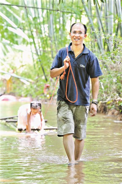 四年前,馮文彬帶著他的田園夢創(chuàng)立了“耕山小寨”。夏日氣溫達到了37℃,站在室外即使不運動也能大汗淋漓,大多數(shù)人寧愿在空調(diào)房里也不愿意出門,但馮文彬和另外兩個合伙人李志平和李德生卻沒有閑下來。“我們是使用了李志平和李德生家里自有田地來做采摘和親子游活動。”馮文彬說。因為資金不充裕,耕山小寨所有建設(shè)的事情都要親力親為,哪怕是修建上山的小路、挖抓魚的淺水泥潭、制作竹排等,都需要大家一手一腳慢慢做出來的。