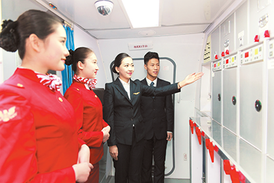 河北廊坊市翔宇航空技工學(xué)校空乘服務(wù)專業(yè)學(xué)生在實訓(xùn)中。