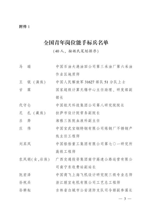 共青團中央、人力資源社會保障部日前聯(lián)合開展了2016—2017年度全國青年崗位能手(標兵)評選活動,決定授予中國石油大港油田公司第三采油廠第六采油作業(yè)區(qū)地質(zhì)師馬瑞等40名同志“全國青年崗位能手標兵”稱號,授予中科院自動化所復(fù)雜系統(tǒng)管理與控制國家重點實驗室副研究員王磊等826名同志“全國青年崗位能手”稱號。