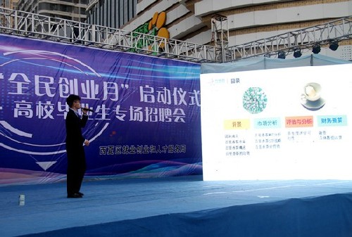 據(jù)悉,此次全民創(chuàng)業(yè)月圍繞“創(chuàng)業(yè)興西夏發(fā)展促和諧”為主題,全民創(chuàng)業(yè)月期間將陸續(xù)開展“618”創(chuàng)業(yè)系列活動,評選表彰創(chuàng)業(yè)帶頭人及創(chuàng)業(yè)示范戶,創(chuàng)業(yè)工作現(xiàn)場觀摩交流,舉辦銀川市第三屆大學(xué)生創(chuàng)業(yè)營銷挑戰(zhàn)賽及創(chuàng)業(yè)導(dǎo)師、創(chuàng)業(yè)服務(wù)團巡講等10項活動,8-11月還將持續(xù)開展各類創(chuàng)業(yè)活動。同時將設(shè)立西夏區(qū)大學(xué)生創(chuàng)業(yè)貸款,鼓勵和扶持大學(xué)生自主創(chuàng)業(yè)。