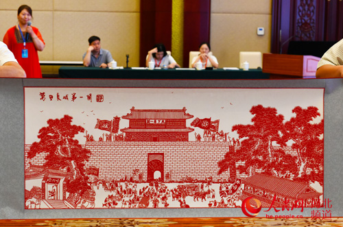 ?圖為殘疾人家庭手工業(yè)項目小組成員展示創(chuàng)新剪紙畫《萬里長城第一關(guān)》。付兆颯 攝