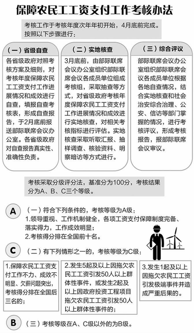 保障農(nóng)民工工資支付,事關(guān)廣大農(nóng)民工切身利益,事關(guān)社會(huì)公平正義和社會(huì)和諧穩(wěn)定,是一項(xiàng)十分重要的民生工作。黨中央、國務(wù)院歷來高度重視解決拖欠農(nóng)民工工資問題。2017年,國務(wù)院辦公廳印發(fā)《保障農(nóng)民工工資支付工作考核辦法》,《辦法》規(guī)定從2017年到2020年,每年對各省級政府保障農(nóng)民工工資支付工作進(jìn)行年度考核,以加強(qiáng)保障農(nóng)民工工資支付工作的屬地監(jiān)管責(zé)任。
