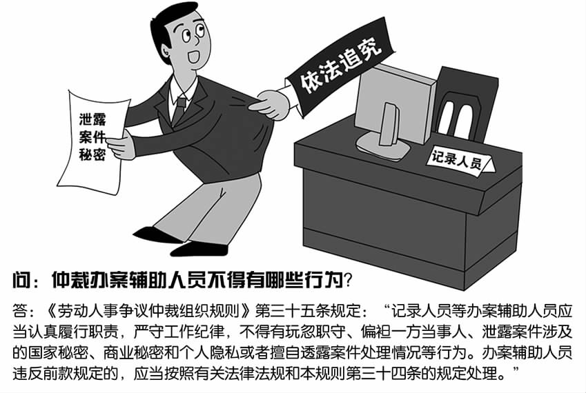 《勞動(dòng)人事爭議仲裁組織規(guī)則》第三十五條規(guī)定:“記錄人員等辦案輔助人員應(yīng)當(dāng)認(rèn)真履行職責(zé),嚴(yán)守工作紀(jì)律,不得有玩忽職守、偏袒一方當(dāng)事人、泄露案件涉及的國家秘密、商業(yè)秘密和個(gè)人隱私或者擅自透露案件處理情況等行為。辦案輔助人員違反前款規(guī)定的,應(yīng)當(dāng)按照有關(guān)法律法規(guī)和本規(guī)則第三十四條的規(guī)定處理。”