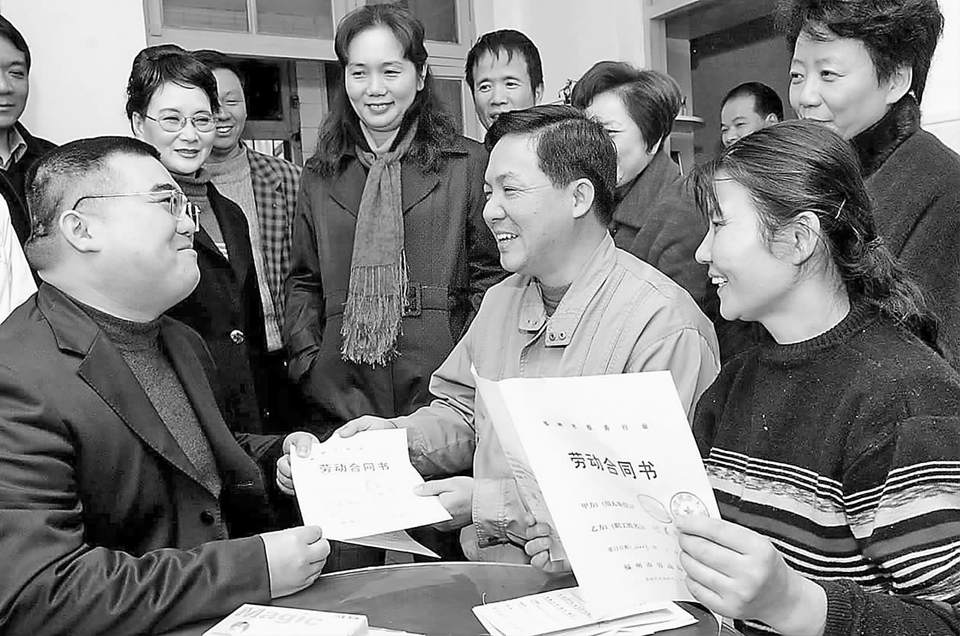 2003年春節(jié)前夕,福建省福州市廣泛發(fā)動社會各界力量,深入開展“春風”送崗、“春風”送暖活動。圖為2003年1月5日,福州市一家用工單位負責人(左一)一行冒著嚴寒來到下崗職工程昱(右二)家中,與雙雙下崗的程昱夫婦簽訂了勞動合同書,將就業(yè)崗位送到他們手中。(張國俊 攝)