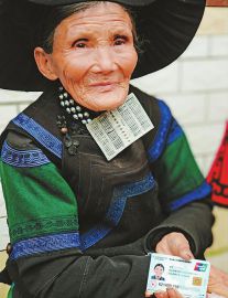 10月11日, 在四川省涼山彝族自治州喜德縣拉克鄉(xiāng)新村村,83歲的彝族奶奶的莫呷呷在家門(mén)口展示社保卡。為方便貧困戶接收各種補(bǔ)貼資金,當(dāng)?shù)貜?“一疊卡”到 “一卡通”,助力脫貧攻堅(jiān)。(劉紅霞 攝)