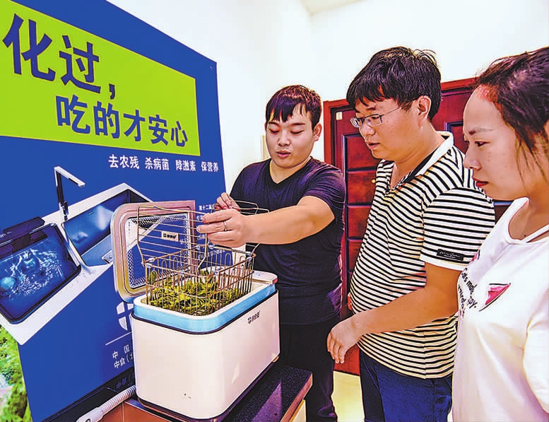 8月5日,在河北省廊坊市廣陽(yáng)區(qū)蟻巢創(chuàng)客空間,創(chuàng)業(yè)團(tuán)隊(duì)在測(cè)試家用食品凈化設(shè)備的蔬菜清洗功能。(李曉果 攝)