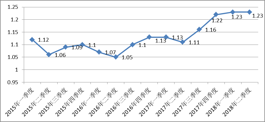 圖1:2015年一季度-2018年二季度崗位空缺與求職人數比率變化趨勢