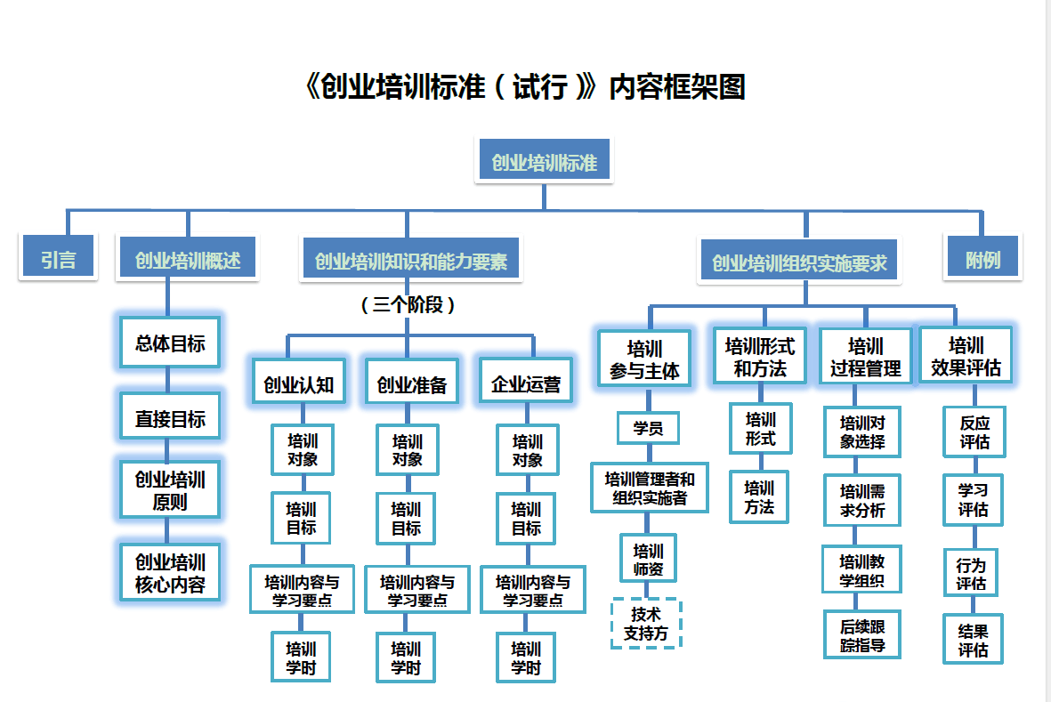 創(chuàng)業(yè)培訓(xùn)標(biāo)準(zhǔn)包括“創(chuàng)業(yè)培訓(xùn)概述”、“創(chuàng)業(yè)培訓(xùn)知識和能力要素”、“創(chuàng)業(yè)培訓(xùn)組織實施要求”以及“附例”四個部分。系統(tǒng)回答了創(chuàng)業(yè)培訓(xùn)是什么、面向誰、培訓(xùn)什么和怎么培訓(xùn)等一系列問題,既有內(nèi)在的理論邏輯,更有務(wù)實的操作指導(dǎo)。其中,“創(chuàng)業(yè)培訓(xùn)組織實施要求”是本標(biāo)準(zhǔn)的重要內(nèi)容,從培訓(xùn)參與主體、培訓(xùn)形式和方法、培訓(xùn)過程管理和培訓(xùn)效果評估四個方面進(jìn)行了規(guī)范要求,是多年來開展創(chuàng)業(yè)培訓(xùn)工作的經(jīng)驗總結(jié)和精華提煉,具有實用價值和指導(dǎo)意義。