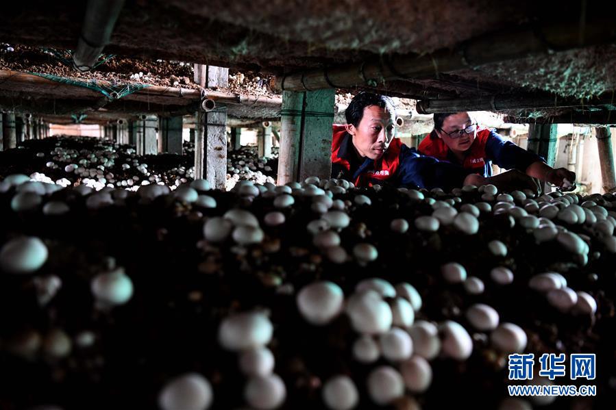 5月7日,鄧偉(左)和妻子歐明艷在食用菌種植基地內(nèi)采摘雙孢菇。(新華社記者劉軍喜攝)