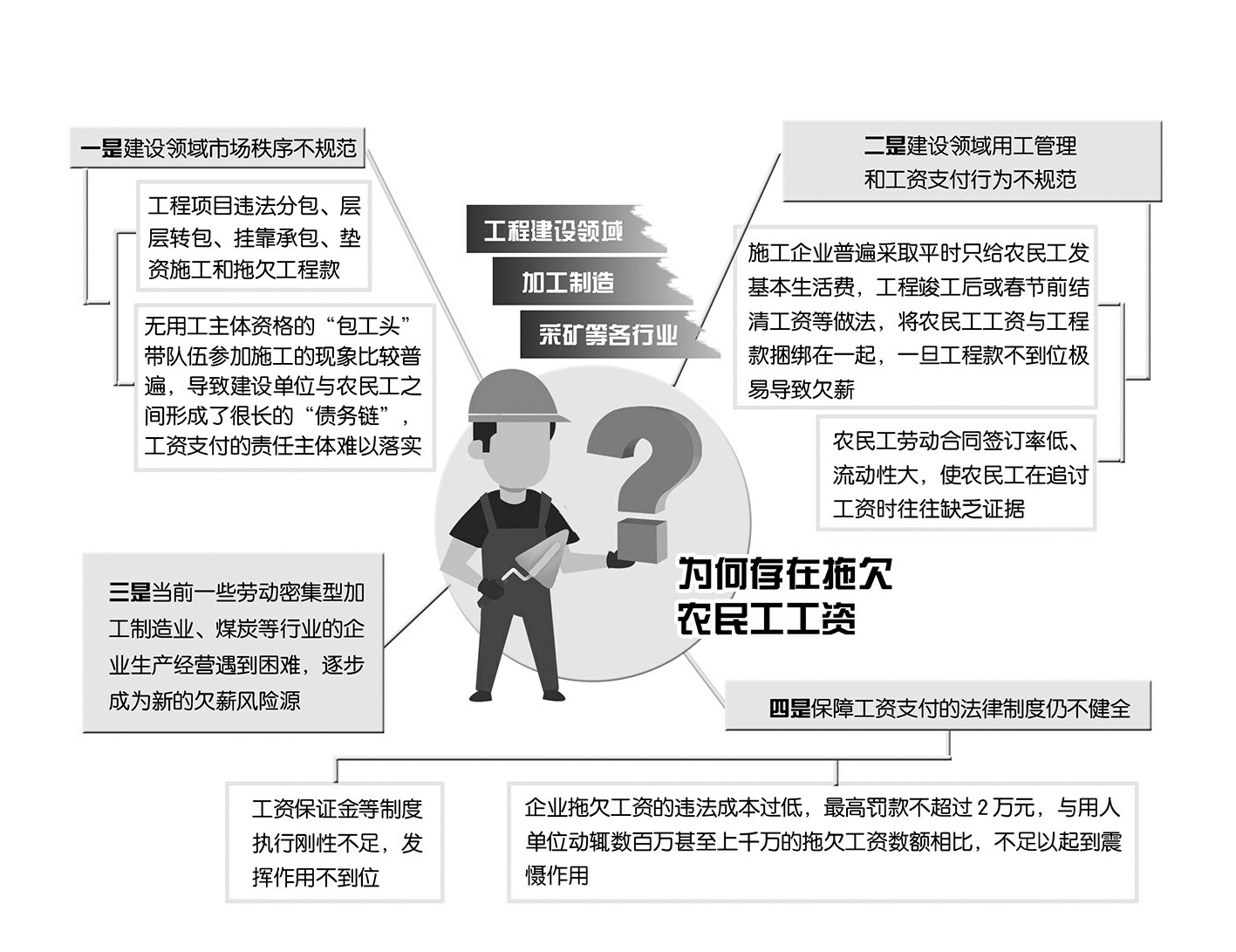 近年來(lái),農(nóng)民工欠薪問(wèn)題一直是全社會(huì)共同關(guān)注的焦點(diǎn),日前,人社部公布2019年第二批拖欠勞動(dòng)報(bào)酬典型案件,十起案件六起與工程建設(shè)有關(guān)。工程建設(shè)領(lǐng)域農(nóng)民工工資支付保障是治欠保支的工作重點(diǎn),事關(guān)廣大農(nóng)民工切實(shí)利益和社會(huì)公平正義。在工程建設(shè)領(lǐng)域,農(nóng)民工欠薪問(wèn)題的治理取得了哪些成效?還存在哪些問(wèn)題?接下來(lái)應(yīng)當(dāng)做怎樣的制度安排?帶著這些問(wèn)題,記者進(jìn)行了相關(guān)采訪。