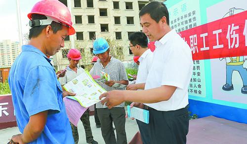 近日,山東泗水人社局深入轄區(qū)內(nèi)各施工企業(yè),積極開展工傷預(yù)防宣傳活動(dòng)。工作人員通過(guò)張貼宣傳掛圖、發(fā)放《工傷保險(xiǎn)條例》和《工傷預(yù)防宣傳畫》材料等,向工人講解工傷保險(xiǎn)政策,提高建筑業(yè)一線工人的工傷預(yù)防知識(shí)水平。圖為工傷預(yù)防宣傳現(xiàn)場(chǎng),工作人員(右一)在向工人講解工傷保險(xiǎn)政策。