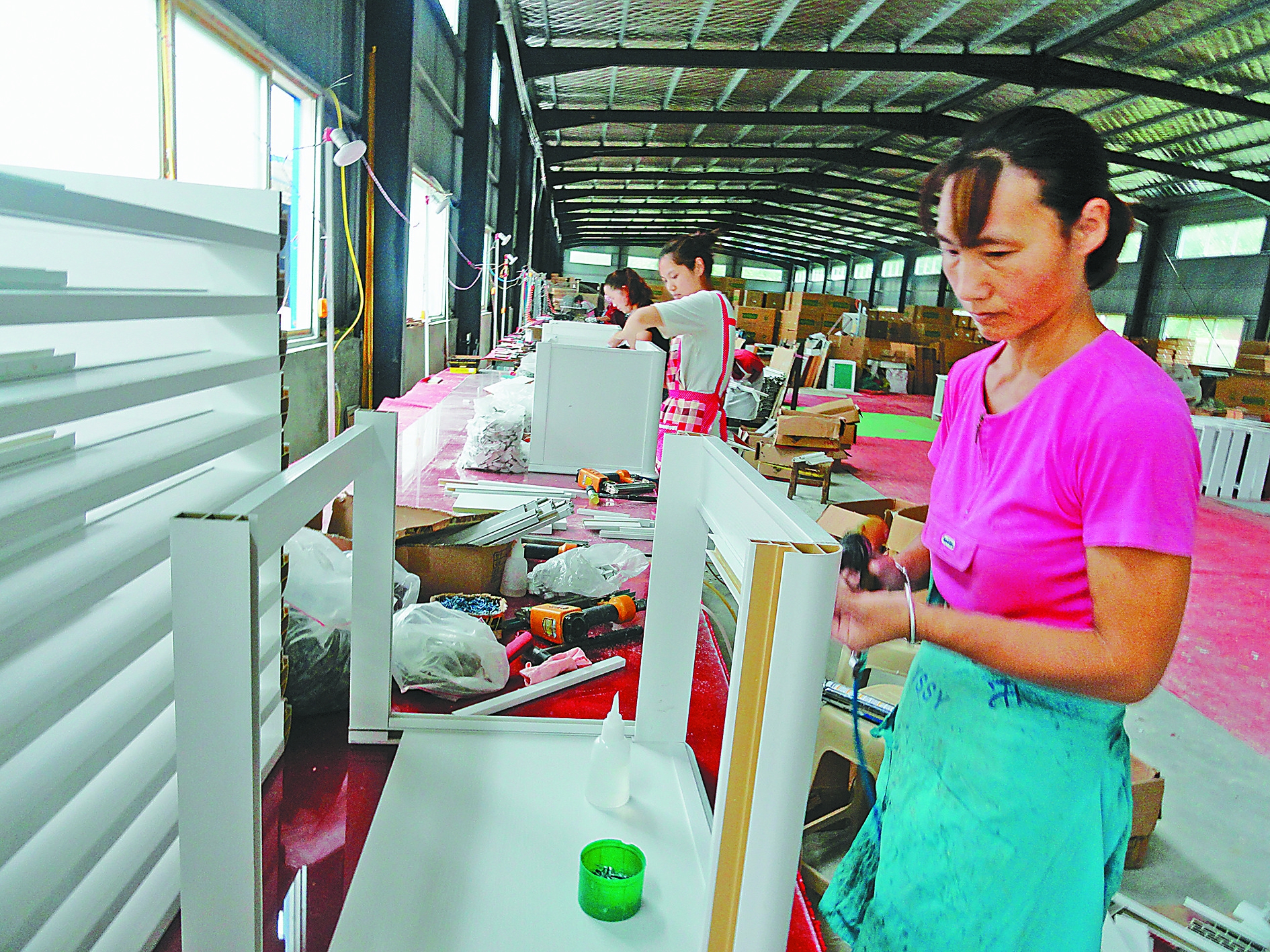 河南省商水縣黃寨鎮(zhèn)共創(chuàng)建6個(gè)扶貧車間,安排300多名留守婦女和貧困人員就業(yè),人均月工資可達(dá)2000多元。圖為近日,王老莊村貧困人員在村扶貧車間加工柜子。(喬連軍 攝)