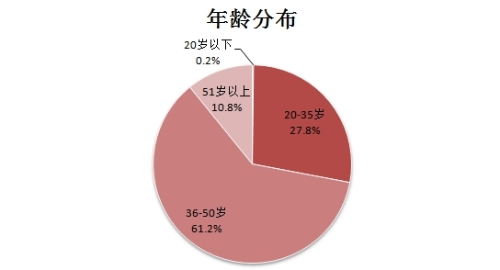 1、【年齡分布】問卷提交者的年齡區(qū)間多在36~50歲,共1257人占61.17%。其他年齡區(qū)間為:20歲以下的4人,占0.19%;20~35歲的571人,占27.79%;51歲以上223人,占10.85%。男性1459人,占71%;女性596人,占29%。
