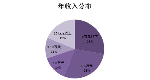 5、【薪資水平分布】問卷提交者中,年收入在4萬元以下者共570人,占27.74%;年收入在5-6萬元者共為580人,占28.22%;年收入在7-8萬元者共為285人,占13.87%;年收入9-10萬元者共有234人,占11.39%;年收入10萬元以上人數(shù)為386人,占18.78%。