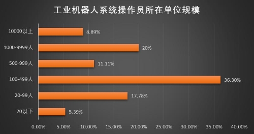 2、【所在企業(yè)規(guī)模】20人及以下占比5.39%,20-99人占比17.78%,100-499人占比36.3%,500-999人占比11.11%,10000-9999人及以上占比20%,10000以上的占比8.89%。工業(yè)機器人系統(tǒng)操作員所在企業(yè)規(guī)模分布均勻,大、中、小、微型公司都需要系統(tǒng)操作員推動轉(zhuǎn)型。