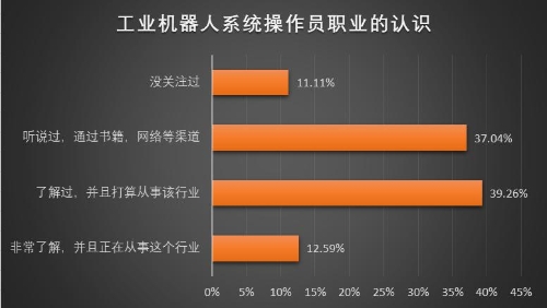 5、【職業(yè)認識】從業(yè)工作人員中39.26%對工業(yè)機器人系統(tǒng)操作員新職業(yè)是了解過的,并且打算和愿意從事該項職業(yè)。