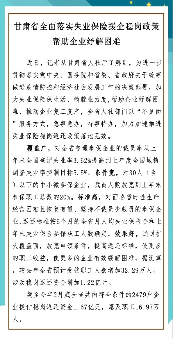 甘肅:全面落實失業(yè)保險援企穩(wěn)崗政策幫助企業(yè)紓解困難