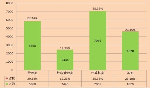專業(yè)來源分為4個大類,分別是數(shù)理類、經(jīng)濟(jì)管理類、計算機類及其他專業(yè)。計算機類占比最高,其次是數(shù)理類。項目組調(diào)研企業(yè)大數(shù)據(jù)人才的各專業(yè)人數(shù)和占比見下圖。