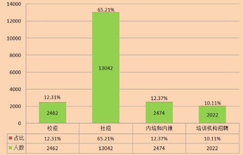 大數(shù)據(jù)人才的渠道來源分為4個大類,分別是校招、社招、內(nèi)部培養(yǎng)和推薦、培訓(xùn)機構(gòu)招聘。企業(yè)大數(shù)據(jù)人才各渠道來源的人數(shù)和占比見下圖。