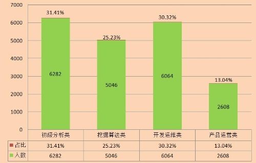 ①初級分析類,包括業(yè)務(wù)數(shù)據(jù)分析師、商務(wù)數(shù)據(jù)分析師等。②挖掘算法類,包括數(shù)據(jù)挖掘工程師、機器學(xué)習(xí)工程師、深度學(xué)習(xí)工程師、算法工程師、AI工程師、數(shù)據(jù)科學(xué)家等。③開發(fā)運維類,包括大數(shù)據(jù)開發(fā)工程師、大數(shù)據(jù)架構(gòu)工程師、大數(shù)據(jù)運維工程師、數(shù)據(jù)可視化工程師、數(shù)據(jù)采集工程師、數(shù)據(jù)庫管理員等。④產(chǎn)品運營類,包括數(shù)據(jù)運營經(jīng)理、數(shù)據(jù)產(chǎn)品經(jīng)理、數(shù)據(jù)項目經(jīng)理、大數(shù)據(jù)銷售等。四類崗位的數(shù)量和占比見下圖。