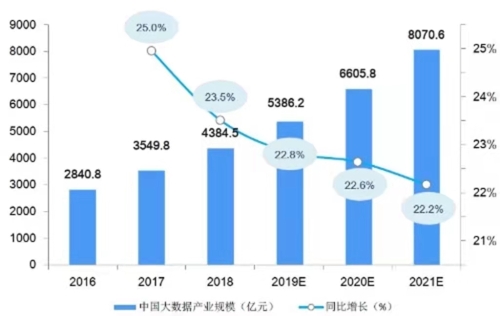 2019年5月6日中國信息通信研究院發(fā)布《中國大數(shù)據(jù)與實體經(jīng)濟(jì)融合發(fā)展白皮書(2019年)》,書中綜合國內(nèi)外環(huán)境、新興技術(shù)發(fā)展等多種因素,測算2018年我國大數(shù)據(jù)產(chǎn)業(yè)增速約為15%,產(chǎn)值達(dá)到5405億元。另據(jù)賽迪數(shù)據(jù)顯示,2018年中國大數(shù)據(jù)產(chǎn)業(yè)規(guī)模為4384.5億元,同比增長23.5%;到2021年,中國大數(shù)據(jù)產(chǎn)業(yè)規(guī)模將超過8000億元。