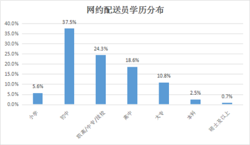 根據(jù)美團(tuán)《2018年外賣騎手就業(yè)報(bào)告》,網(wǎng)約配送員的學(xué)歷以初中、高中學(xué)歷為主,值得注意的是,擁有大學(xué)文憑(大專、本科、碩士及以上)的網(wǎng)約配送員比例近15%。