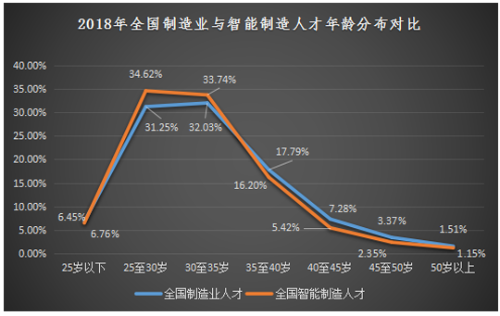 對比智能制造與制造業(yè)人才年齡分布情況可以看出,智能制造人才在25至30歲、30至35歲年齡段的人才占比高于制造業(yè),35至40歲、40至45歲、45至50歲、50歲以上年齡段的人才比例均低于制造業(yè),說明從事智能制造崗位的年輕人比傳統(tǒng)制造業(yè)更多,年齡優(yōu)勢能給智能制造的發(fā)展帶來更多的想象空間。