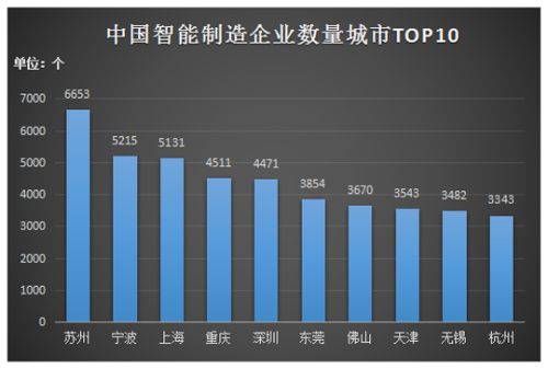 6.【企業(yè)分布】據(jù)《世界智能制造中心發(fā)展趨勢報告(2019)》報告顯示,智能制造企業(yè)數(shù)量排前十的城市,分別是蘇州、寧波、上海、重慶、深圳、東莞、佛山、天津、無錫和杭州。其中蘇州數(shù)量最高達6653家;寧波和上海旗鼓相當(dāng),分別為5215家和5131家。