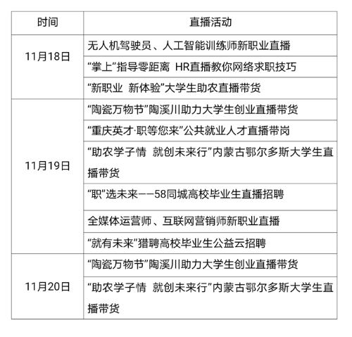 活動(dòng)將持續(xù)到年底,目前已推出11場(chǎng)直播活動(dòng)。其中,直播帶崗重點(diǎn)圍繞新興產(chǎn)業(yè)、熱門(mén)行業(yè)、重點(diǎn)企業(yè)等組織招聘,并安排職業(yè)指導(dǎo)師現(xiàn)場(chǎng)咨詢指導(dǎo),共有21家企業(yè)提供4.1萬(wàn)個(gè)崗位,同步發(fā)布6萬(wàn)個(gè)線上招聘崗位。新職業(yè)體驗(yàn)重點(diǎn)圍繞人工智能訓(xùn)練師、互聯(lián)網(wǎng)營(yíng)銷(xiāo)師等需求熱的新職業(yè)進(jìn)行直播宣介,講解職業(yè)特點(diǎn)和職業(yè)發(fā)展,還為高校畢業(yè)生提供職業(yè)體驗(yàn)機(jī)會(huì),增加實(shí)踐經(jīng)驗(yàn)。