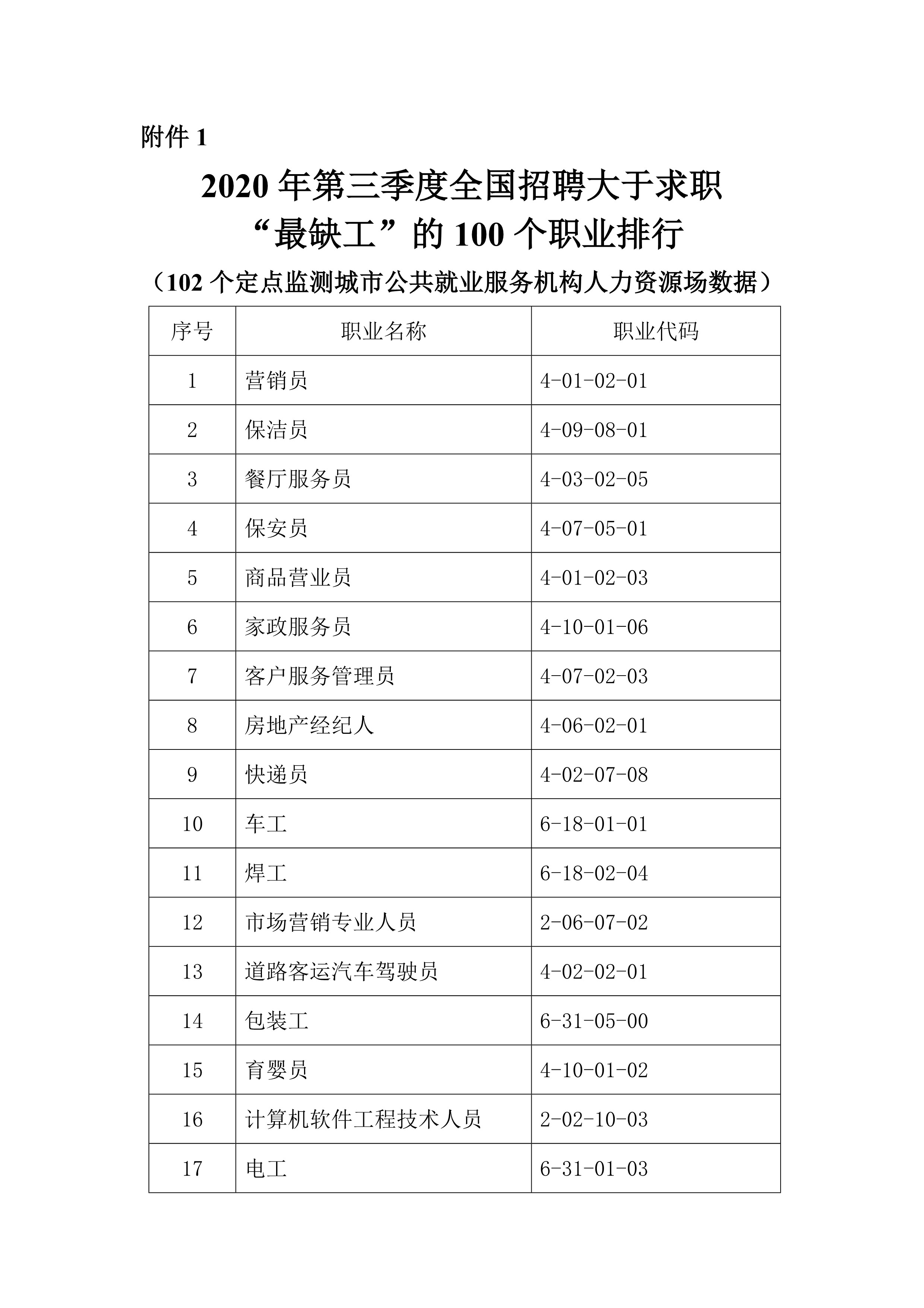 附件:1.2020年第三季度全國招聘大于求職“最缺工”的100個(gè)職業(yè)排行