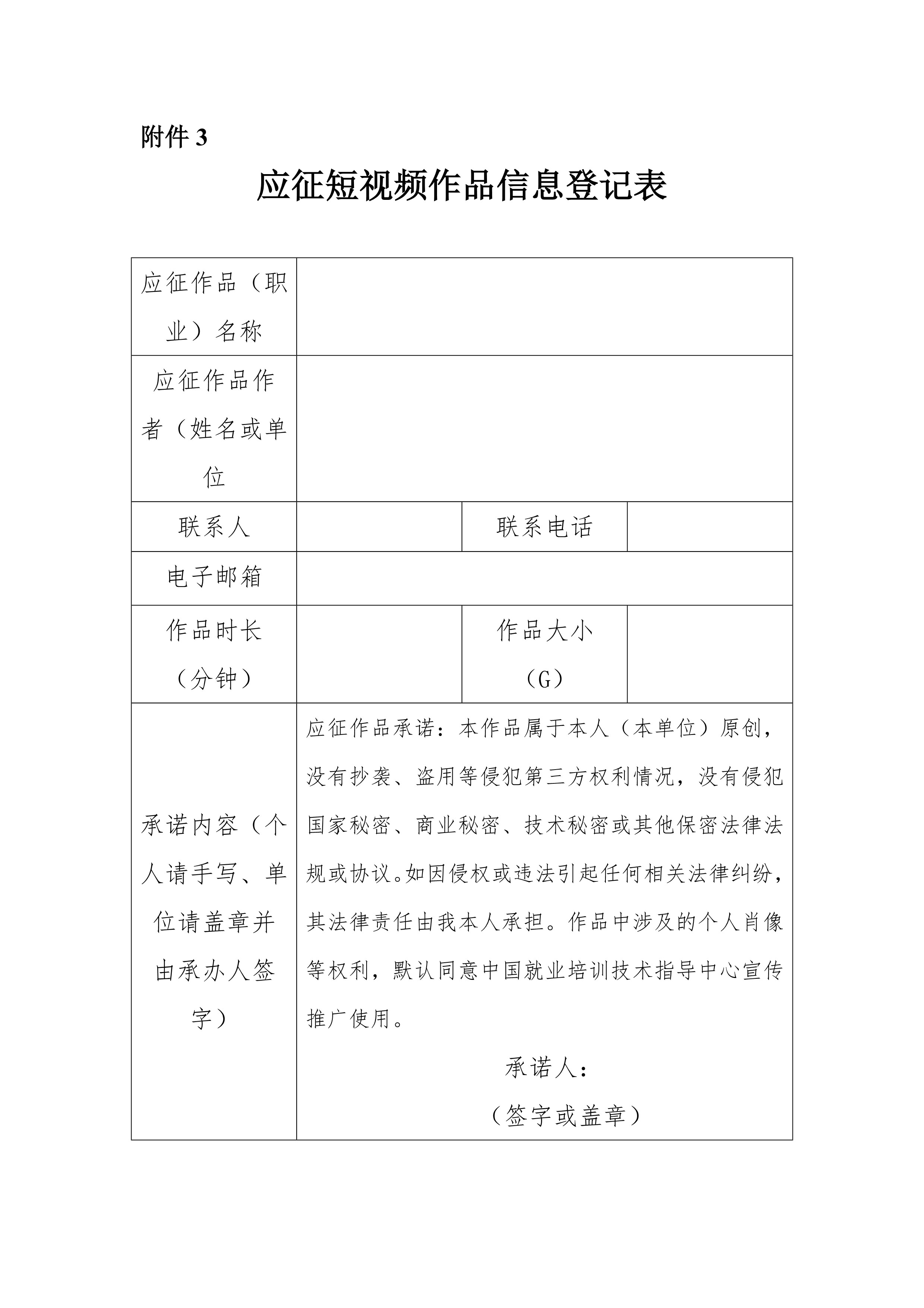 以個(gè)人或者單位名義制作短視頻,將作品以附件或者百度網(wǎng)盤鏈接形式,郵件發(fā)至:jiuyefuwuchu@cettic.gov.cn,郵件標(biāo)題格式為“姓名+聯(lián)系方式+作品名稱+投稿”。同時(shí)提交簽字(蓋章)的PDF版應(yīng)征短視頻作品信息登記表(參見附件3)。