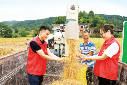 秋收時(shí)節(jié),貴州省余慶縣人社部門組織志愿服務(wù)隊(duì)、鄰里互助隊(duì),深入田間地頭,抓晴天、搶秋收,確保秋收糧食顆粒歸倉,農(nóng)民豐產(chǎn)豐收。圖為該市人社干部幫助群眾收割稻谷。
