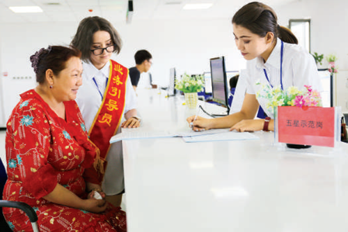 新疆庫車市人社局明確推進(jìn)窗口服務(wù)水平“再上一個(gè)臺(tái)階”的目標(biāo),堅(jiān)持多詢問、多微笑、多聯(lián)系,提升群眾辦事滿意度。圖為“五星示范崗”工作人員為群眾講解業(yè)務(wù)流程。