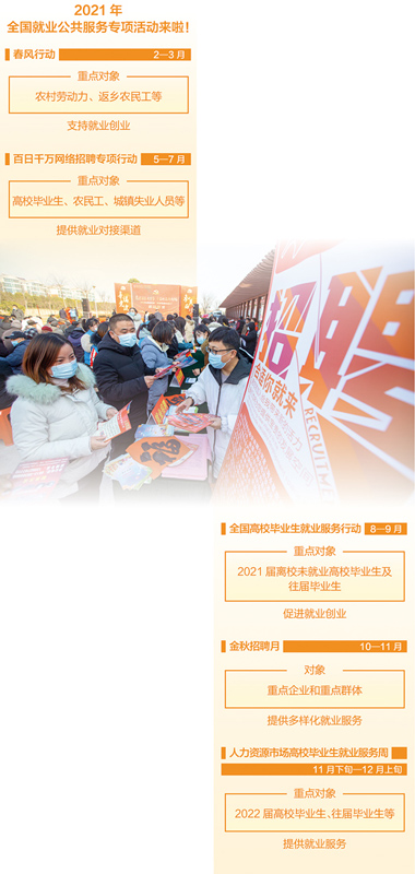 日前,人社部公布2021年全國就業(yè)公共服務(wù)專項活動清單,清單上的就業(yè)援助月、春風(fēng)行動、民營企業(yè)招聘月、百日千萬網(wǎng)絡(luò)招聘專項行動等,有的面向農(nóng)民工,有的聚焦高校畢業(yè)生,有的專門針對殘疾人,1至12月,月月有活動,日日有服務(wù)。