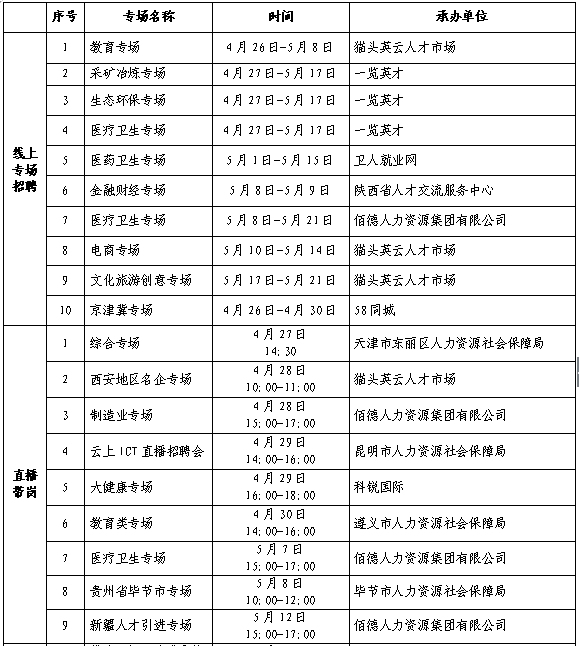 線上活動23場。舉辦教育、采礦冶煉、生態(tài)環(huán)保、醫(yī)藥衛(wèi)生等10場專場招聘會、9場直播帶崗和4場職業(yè)指導直播課。截至4月23日,已有1112家用人單位提供約1.5萬個崗位,后期將有更多用人單位陸續(xù)加入。
