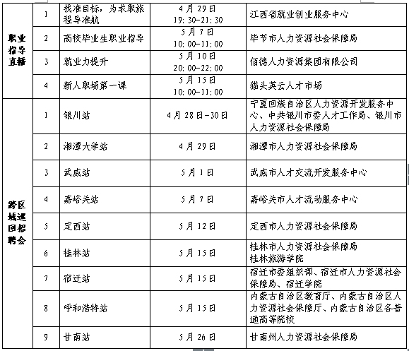 線下活動9場。舉辦銀川站、桂林站、嘉峪關站等9場跨區(qū)域巡回招聘會,除本地用人單位外,還將邀請外省市人社部門組織用人單位組團參會招聘。
