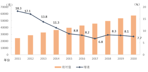 2011-2020年城鎮(zhèn)私營單位就業(yè)人員年平均工資及增速