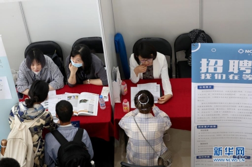 5月19日,在上海第二工業(yè)大學(xué)2021屆畢業(yè)生專場招聘會上,畢業(yè)生了解招聘信息。新華社記者 劉穎 攝